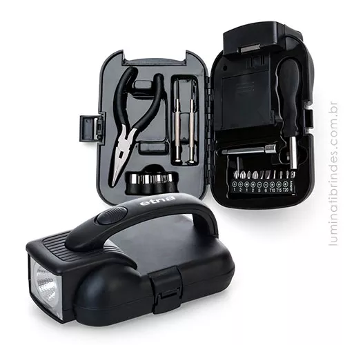 Dentro desta categoria, dispomos de canivetes com corpo emborrachado ou de metal com 4, 8 ou 11 funções, com bússola; kits completos de ferramentas com lanterna na própria caixa; estojo compacto de chaves de fenda; kits compactos de ferramentas; míni estojo com três chaves de fenda; lanternas recarregáveis, luminárias com garras para fixar em livros e revistas; lanterna de bolso para leitura; entre outras opções.